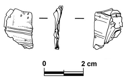- Silver foil with parallel ridges, broken and crumpled with, perhaps, small perforations. Maximum length 22mm. - Paralel kenarları kırılmış ve buruşmuş ve büyük olasılıkla ince delikli gümüş varak parçası. En uzun boyutu 22 mm.