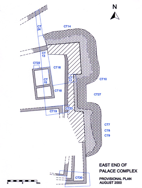 Plan of the east end of the 'Palace Complex' showing structures and trenches.