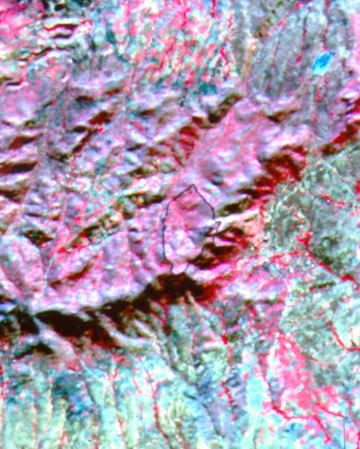 - In this image red indicates moisture, and is thus an indication of vegetation cover, while blue represents agricultural land after the harvest. The intense blue feature at top right is an open-cast coal mine.
