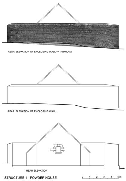 Rectified photo and elevation drawings of the powder house.