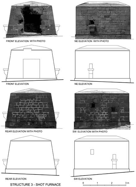 Rectified photo and elevation drawings of the shot furnace.