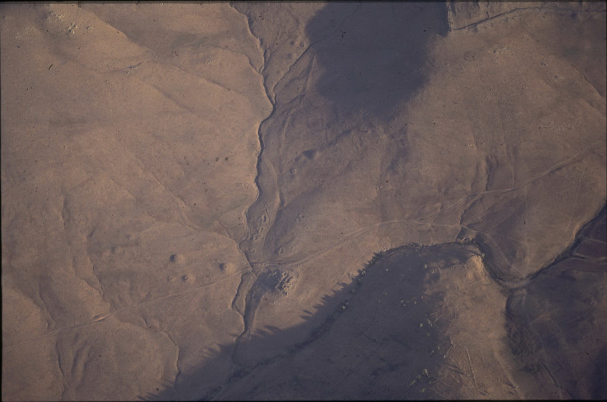 Karabas at centre top and some of the many tumuli outside the city seen from the hot air balloon in 1993. The north tip of the defences can be seen at the left bottom corner of the photo. 1993 yılında sıcak hava balonundan çekilen fotoğrafta, orta üst kısımda Karabaş ile şehir surları dışında kalan pek çok tümülüs görülmektedir.Surların kuzey ucu, fotoğrafın sol alt köşesinde yer almaktadır. |
