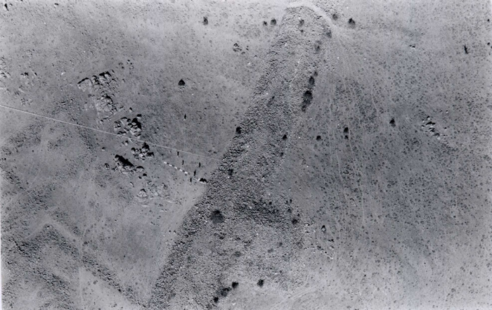 - Şehir savunma sisteminin ölçülen, çizilen ve dijitize edilen bir bölümünün fotoğrafı (bakınız Şekil 6 ve 7'de sağ alt kenar). Duvar fotoğrafın ortasında diyagonal olarak yer alıyor ve dış kulelerden biri de açıkça görülüyor. Duvar yüzü ve taş döşeli şevlerin büyük bölümü moloz altında kalmış fakat taş döşeli şevlerin bir kısmı fotoğrafın üst tarafında düz bir çizgi halinde görülebiliyor; duvarın en üst kısmında ise çobanlarca açılmış bir yol yer alıyor. Duvarın içinde kalan bölgede orta kısmı doğal kayalar dolduruyor, alt kısımlarda ise yapı kalıntıları var. Naylon ölçek 10m. uzunluğunda; duvarın üzerinde ve her iki yanında toprakta görülen beyaz noktacıklar ise beyaz kireçle işaretlenmiş olan ve ana planda takeometrik olarak bağlamış bulunan kontrol noktaları. Fotoğrafın merkezinden sola doğru ise balonun yerden idaresinde kullanılan halat görülebilir. |
