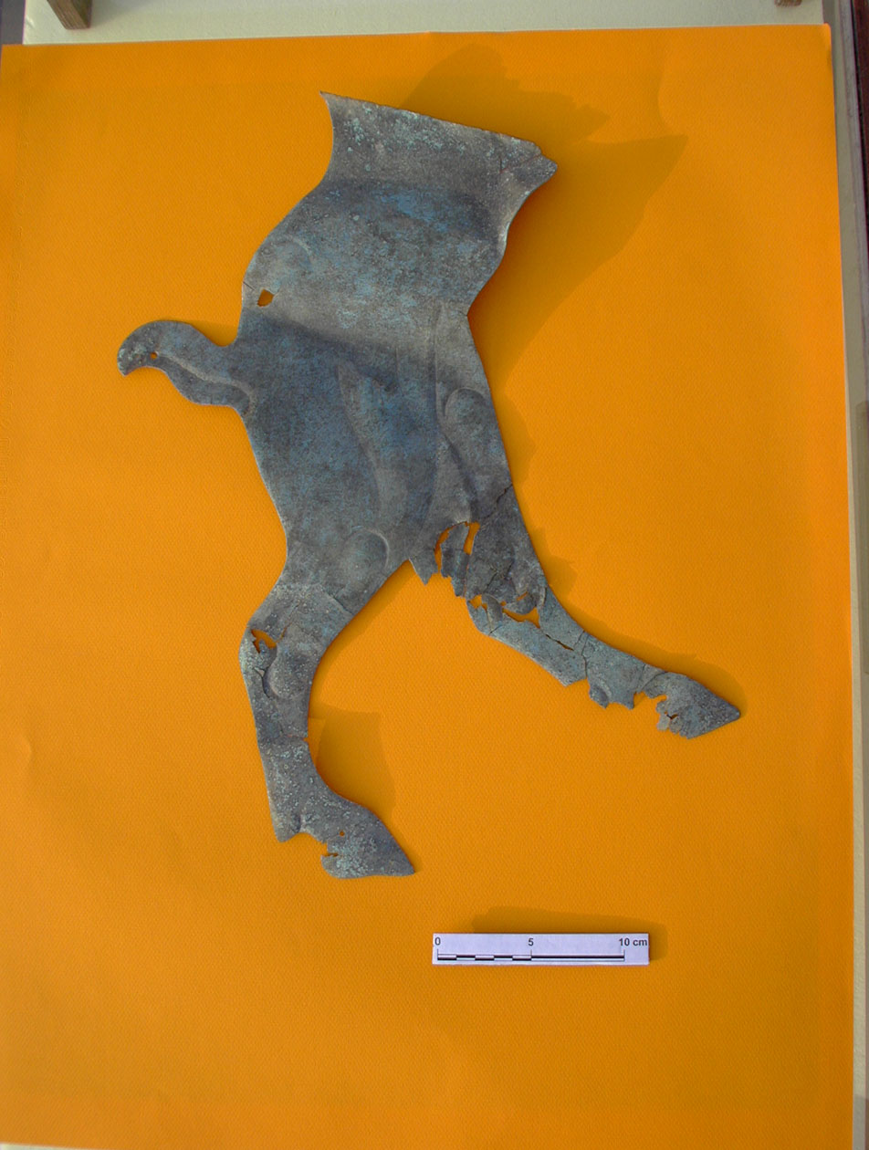 - The lower half of a rampant ibex made from sheet bronze photographed after conservator Noël Siver cleaned and assembled the pieces. There are nail holes in the hooves and tail. - Arka ayakları üzerinde duran bir ibexin alt gövdesini betimleyen bronz levha figür, konservatör Noël Siver tarafından temizlenerek parçaları bir araya getirildikten sonra fotoğraflanmıştır. Toynaklar ile kuyrukta çivi delikleri bulunmaktadır. |