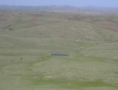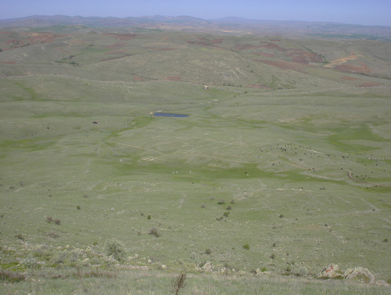 The central part of the city in spring with the artificial Büyük Göl full of water. Stone foundations of urban blocks and structures can be seen as can part of the western defences. Grazing cattle at right provide an idea of scale. The animal pound at centre left lies partially over the megaron that was excavated in the summer season. İlkbaharda şehrin merkezindeki yapay Büyük Göl suyla doluyken. Fotoğrafta yapı adalarının ve bunları dolduran binaların taş temel duvarları ile batı surlarının bir bölümü de görülebilmektedir. Sağ kısımda otlayan sığırlar ölçek konusunda fikir vermektedir. Orta sol kısımda yer alan hayvan barınağı kısmen yaz sezonunda kazılan megaronun üzerinde bulunmaktadır. |