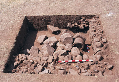 Figure 7: The north corner of Structure D with the stone bases. Şekil 7: Yapı D’nin kuzey köşesi ve taş kaideler