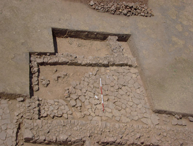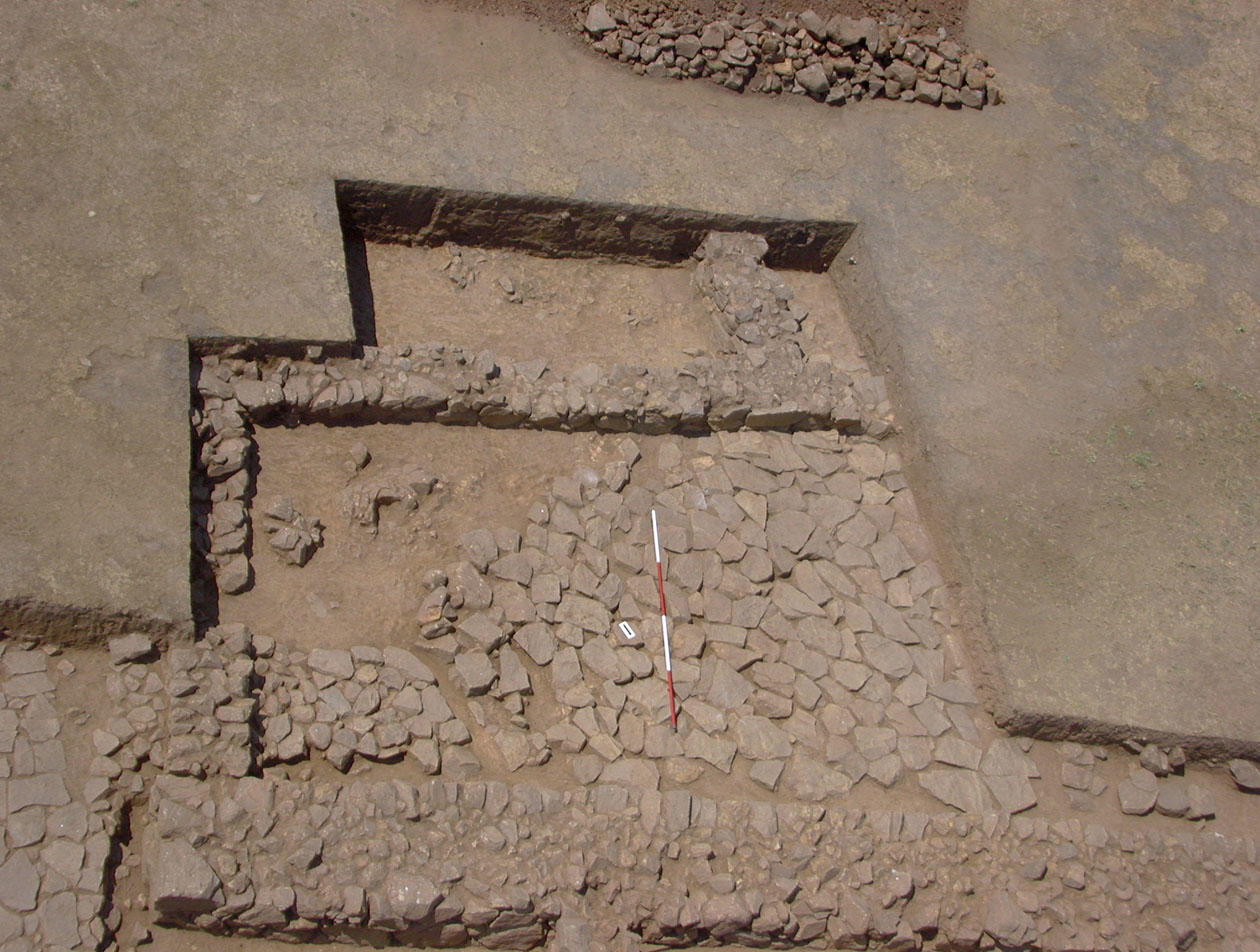 TR06 and TR07 with Structure C at top, the scale rests on external paving between the row of cells and the megaron at bottom. Üst kısımda Yapı C ile birlikte TR06 ve TR07 görülmektedir. Ölçü çubuğu, hücre dizisi ile alt kısımdaki megaron arasında kalan dış kaplama üzerinde bulunmaktadır. |