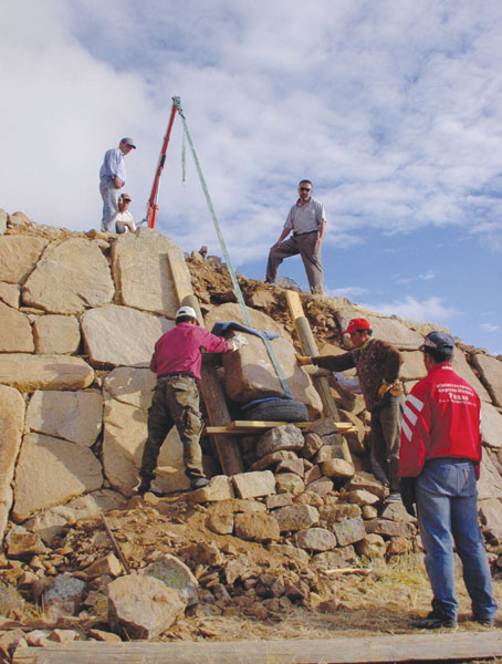 Using a winch to replace large stones that had fallen from the face of the glacis. Ministry Representative Mehmet Katkat skilfully supervised this operation. Taş kaplı eğimli yüzeyden düşen büyük taşların yerine konmasında bir vinç kullanılmıştır. Bu çalışmayı, Bakanlık Temsilcimiz Mehmet Katkat ustalıkla yönetmiştir. |