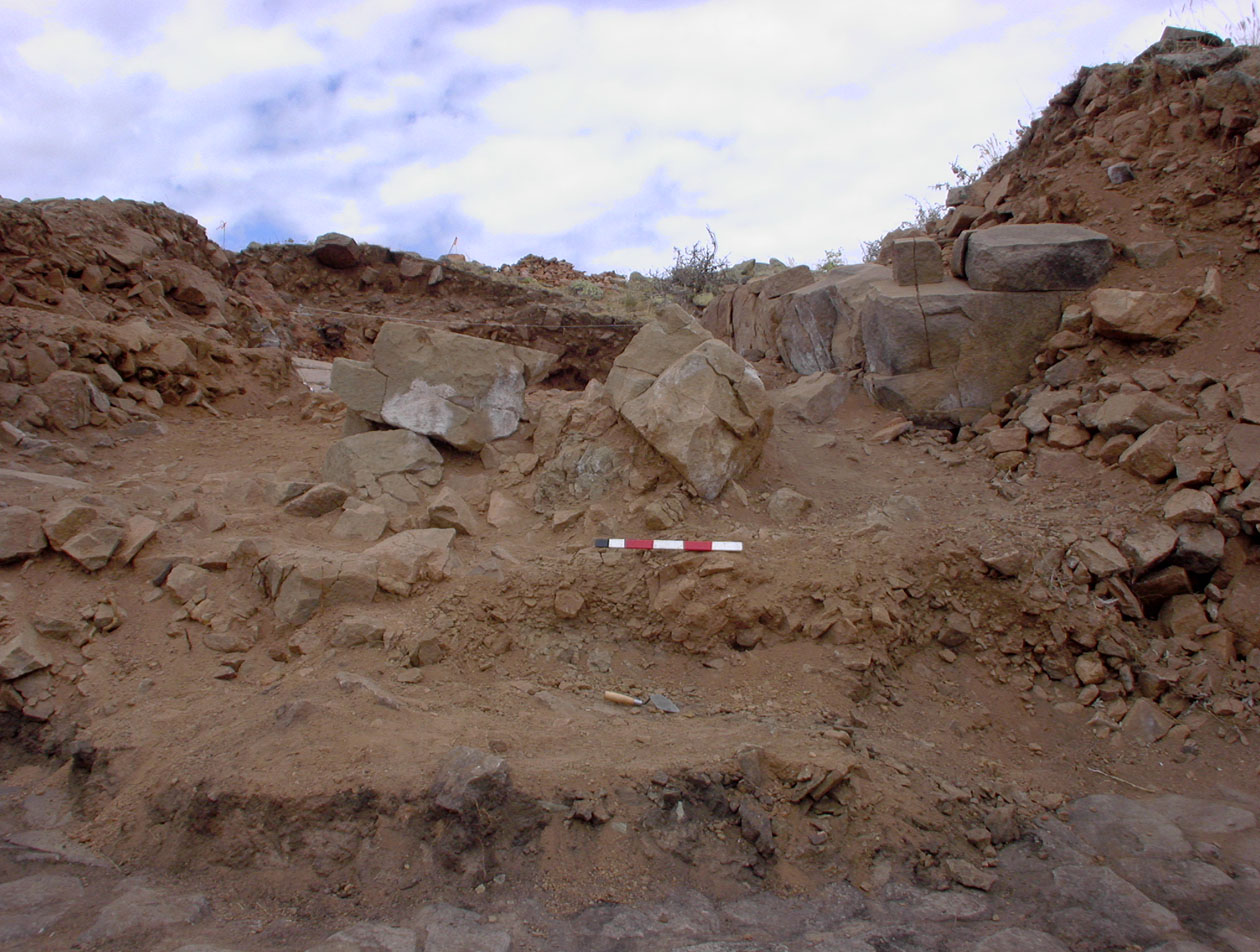 Trench TR11 with the stone paving in the foreground, the granite walling on the tower on the north side of the passage at right and fallen sandstone blocks. Açma TR11 içerisinde, önde taş kaplı alan, sağda geçidin kuzey yanındaki granit duvar ve dökülmüş kumtaşı blokları görülmektedir. |