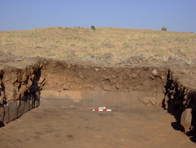 The western end wall of the Ashlar building with scorch marks.