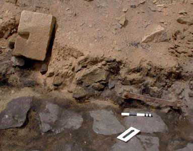 Molozun içinde bulunan, kenet oyuklu bir kumtaşı blok ile küresel başlı çivili büyük bir demir çubuk.
