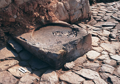 Figure 10:(e) Sandstone column base in TR11 with a 1m diameter circular column seating. Şekil 10: (e) Açma TR11'de ortaya çıkarılan ve üzerinde 1m çapında bir dikme oturtma alanı bulunan kumtaþı dikme kaidesi.