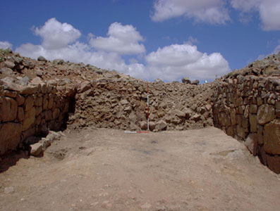 The section through the Gate Passage, trenches TR03 and TR12. The upper part of the eroded gully on the left has not been fully excavated. The three inclined stones in the section immediately right of the vertical pole c. 2m above the surface, represent the later pile of Kapı iç geçidinin açma TR03 ve TR12 ile temizlenen bölümü. Sol taraftaki erozyona uğramış kanalın üst kısmı tamamen kazılmamıştır. Kesitte düşey jalonun hemen sağında zeminin 2.00m kadar üzerinde görülen üç eğimli taş, daha geç döneme ait istinat duvarının parçasıdır. |