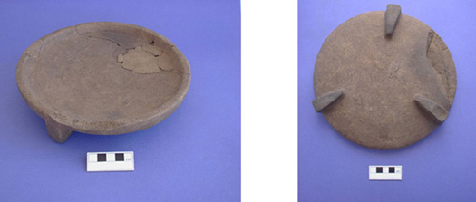 Yapı C'de bulunan üç-ayaklı kumtaşı çanağın alttan ve üstten görünüşü.
